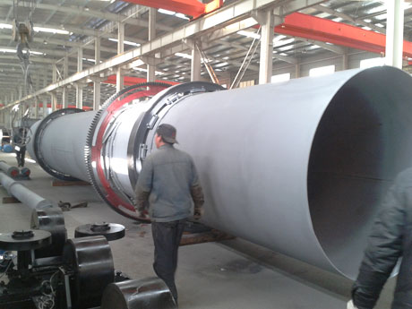 3、烘干机圆筒是一个与水平线略成倾斜的旋转圆筒。物料从较高一端加入,载热体由低端进入,与物料成逆流接触,也有载热体和物料一起并流进入筒体的。
